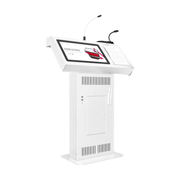 Ультрасовременная модель среди интерактивных трибун, которая включает в себя все самое необходимое для успешного проведения выступлений: профессиональный микрофон для качественной передачи звука, антивандальный корпус, яркий сенсорный экран, документ-камера для отображения необходимых документов на большом экране, дополнительные внешние разъемы. Помимо этого, на трибуне Voice Pro 27" предусмотрено место для размещения документов.