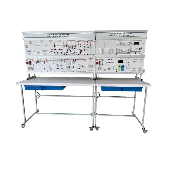 Комплект учебного оборудования «Основы электробезопасности» выполнен в стендовом исполнении: стойки с модулями установлены на собственные лабораторные столы.